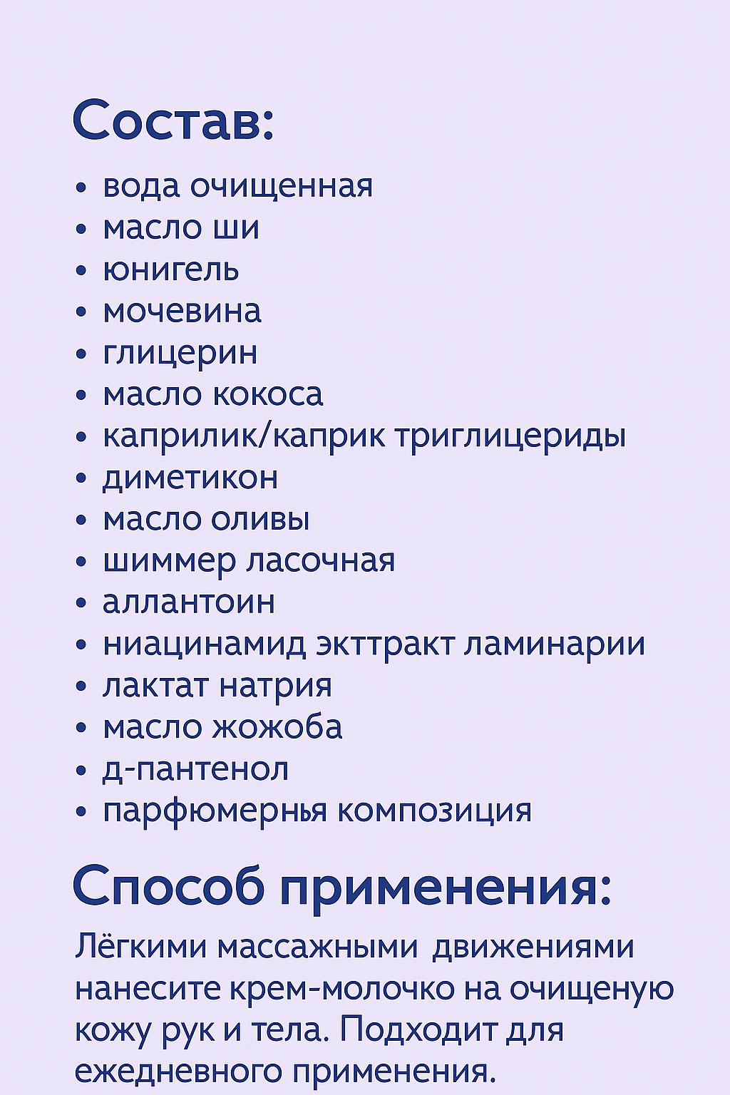 Подходит для ежедневного применения. Наносите на чистую кожу тела легкими массажными движениями.