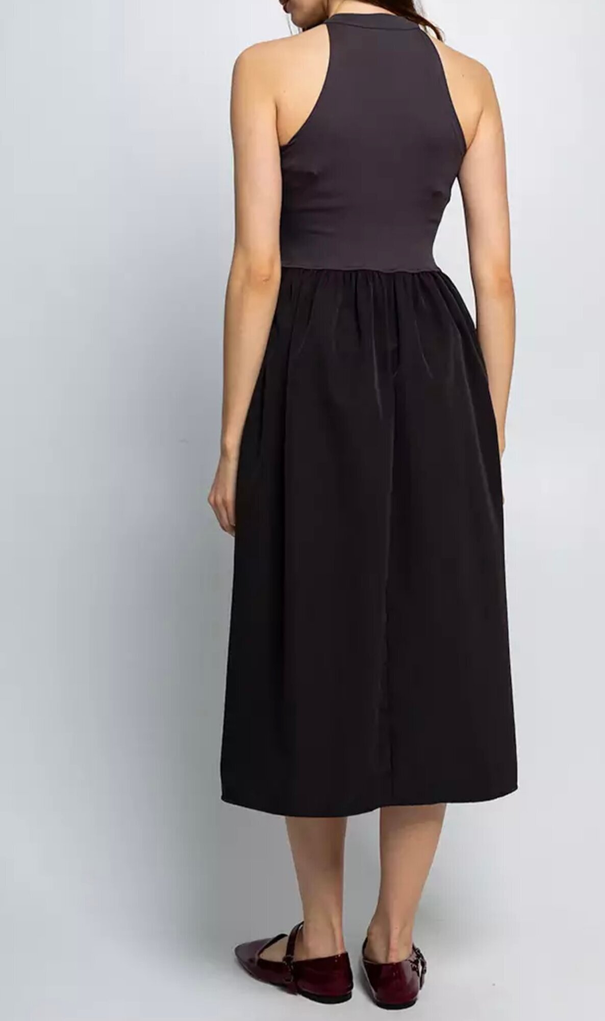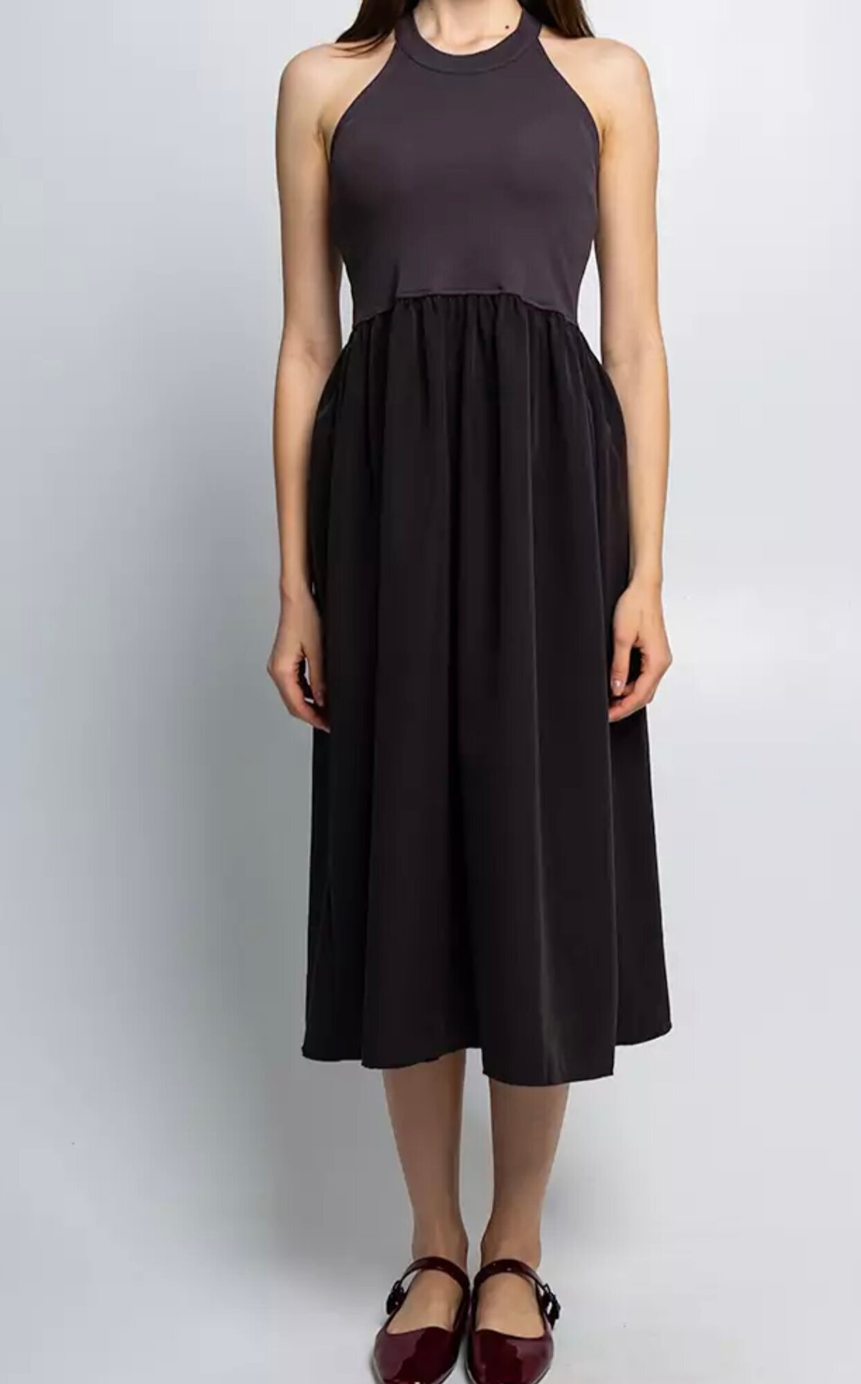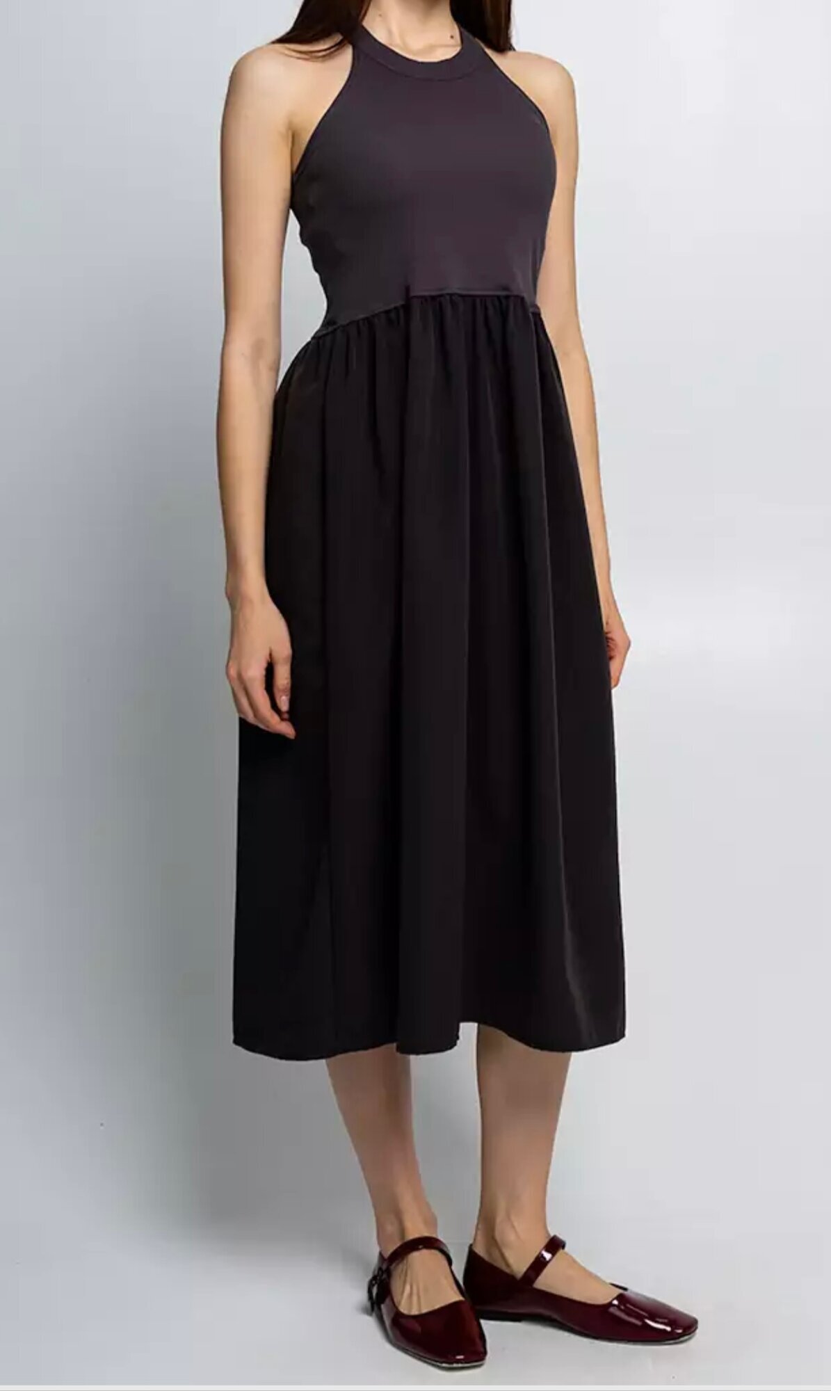 Верх платья выполнен в виде майки с широкими бретелями и округлым вырезом, что обеспечивает комфорт и позволяет подчеркнуть плечи.