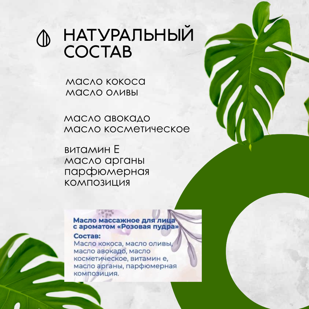 Масло содержит в своем составе натуральные компоненты, такие как масло кокоса, масло оливы, масло авокадо, масло косметическое, витамин Е и масло арганы. Эти ингредиенты обеспечивают интенсивное питание и увлажнение кожи, а также способствуют ее регенерации и восстановлению.