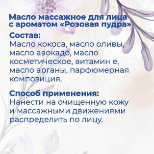 Аромат "Розовая пудра" придает маслу особую изысканность и делает его использование еще более приятным. Парфюмерная композиция создает атмосферу нежности и романтики, делая процесс ухода за кожей настоящим удовольствием.