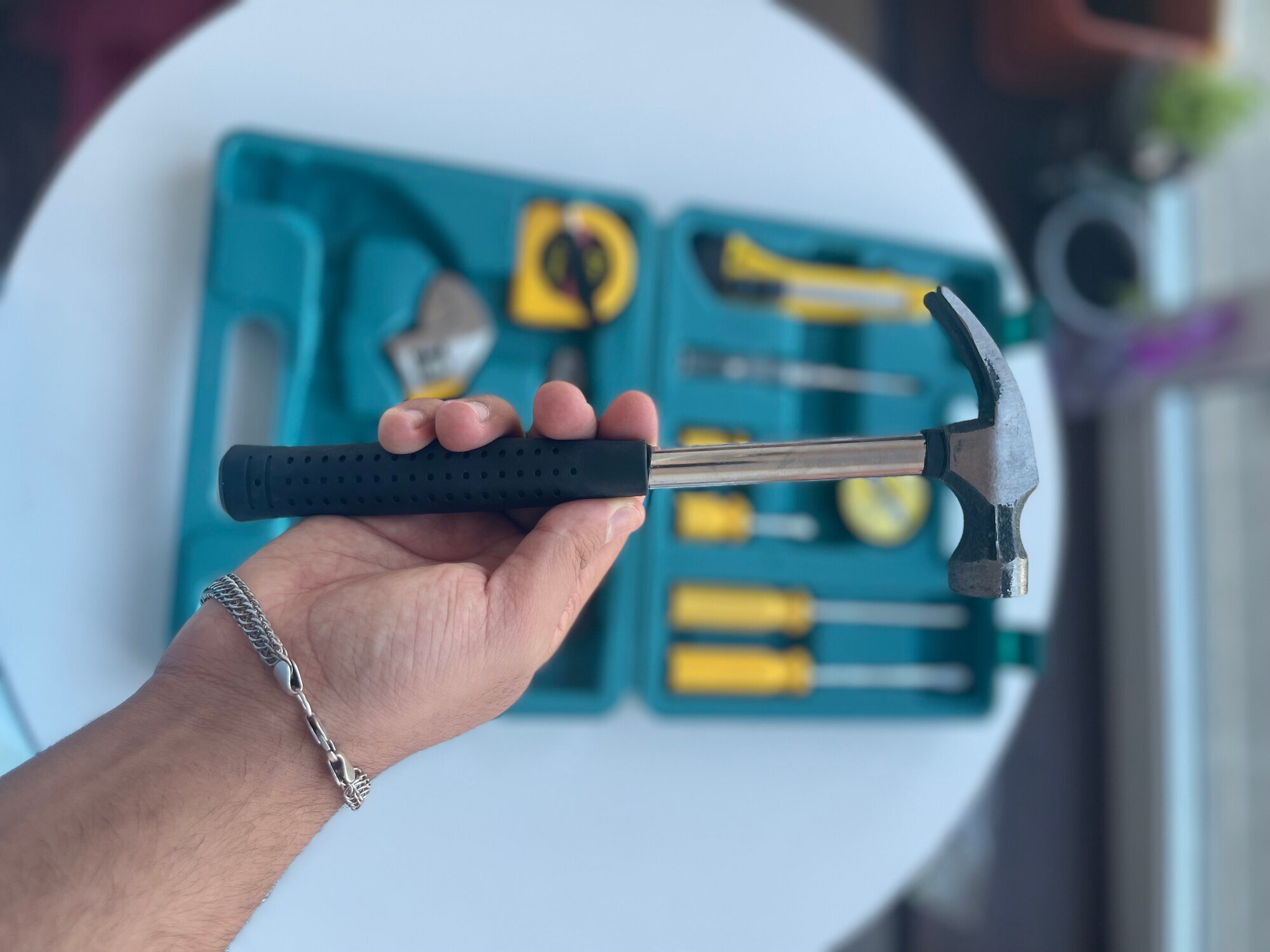 Молоток-гвоздодер с металлической ручкой и пластмассовой ручкой. Этот инструмент позволяет забивать гвозди и выполнять другие работы, связанные с использованием молотка.